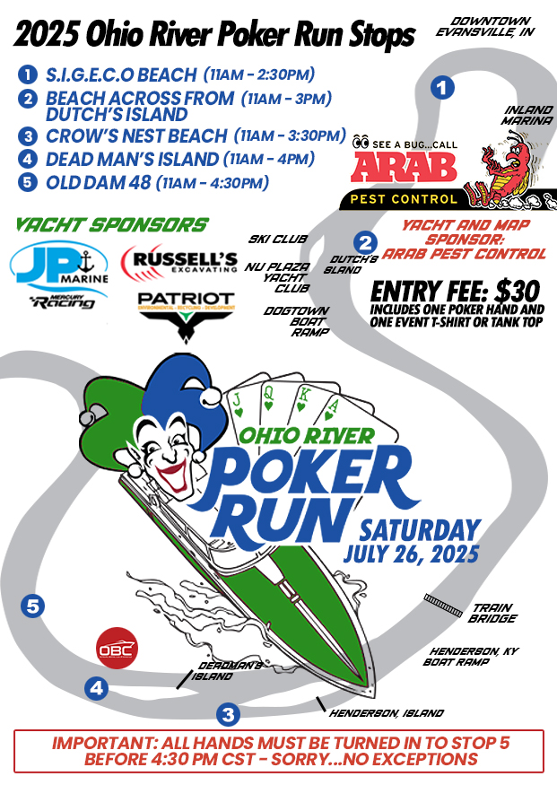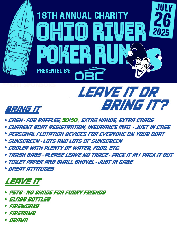 Taking place over 17 miles of Ohio River, the OBC Ohio River Poker Run is one of the longest on the Ohio River. We offer 5 official stops with multiple areas to pick up your hands before starting. Guests are allowed to ride-with and participate as long as they have purchased a hand. T-shirts are made yearly with new designs that are included in the purchase of a Poker Hand as well as entry for our raffle drawing.